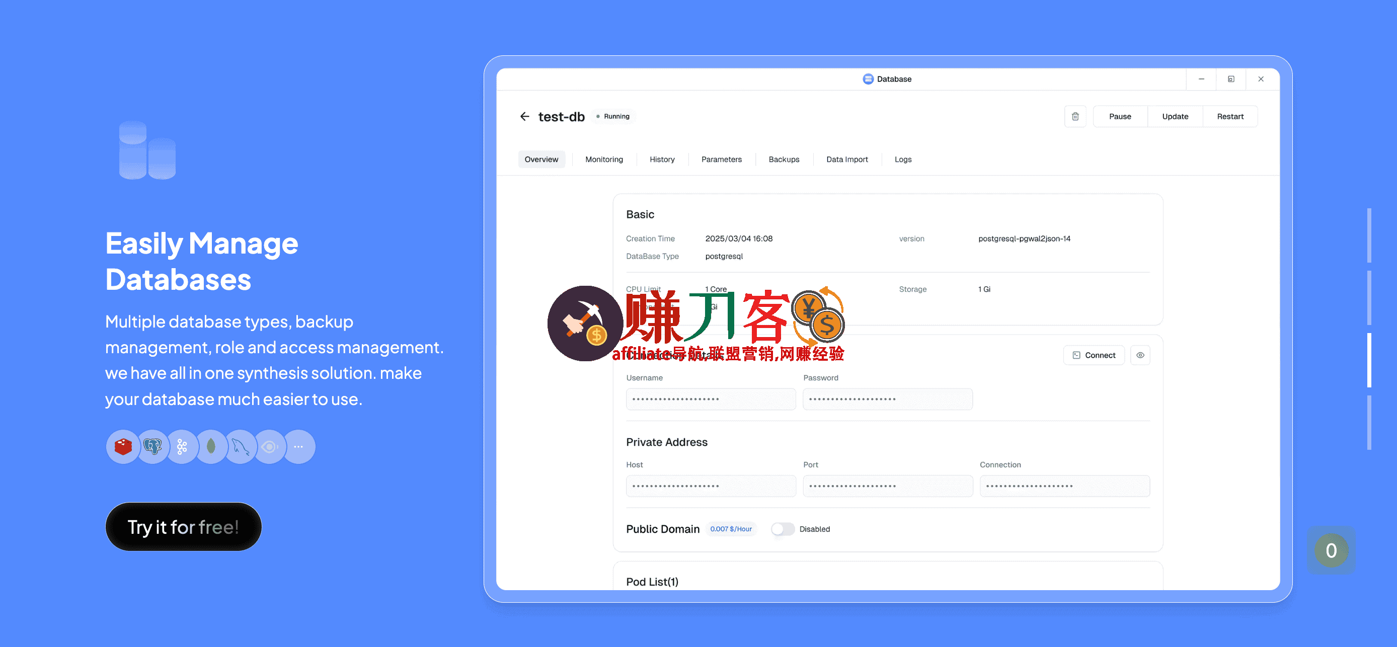 - 提供多种数据库类型,并支持备份管理和访问权限控制。用户可以在同一平台上完成应用和数据库的部署,无需额外配置。