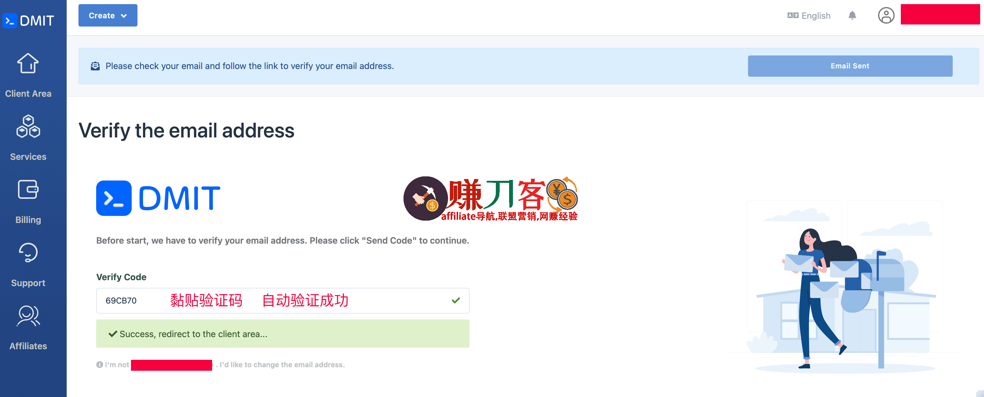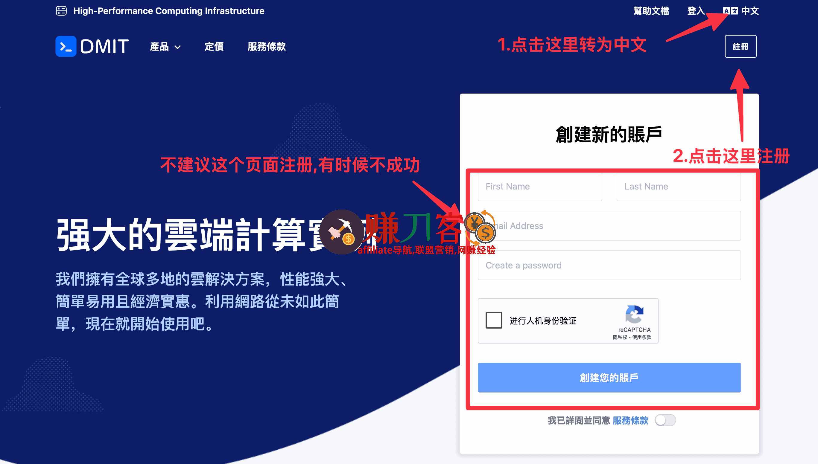 dmit默认显示为英文页面,可点右上角“English”改为中文页面。点击注册按钮,到下一页注册!