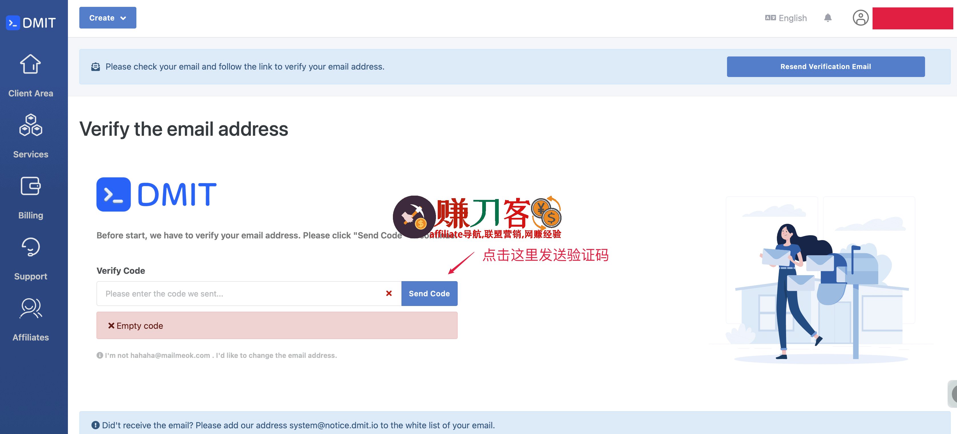 3.1 dmit账号创建成功后,在以下页面点击”send code”按钮,发送验证码到你的注册邮箱!