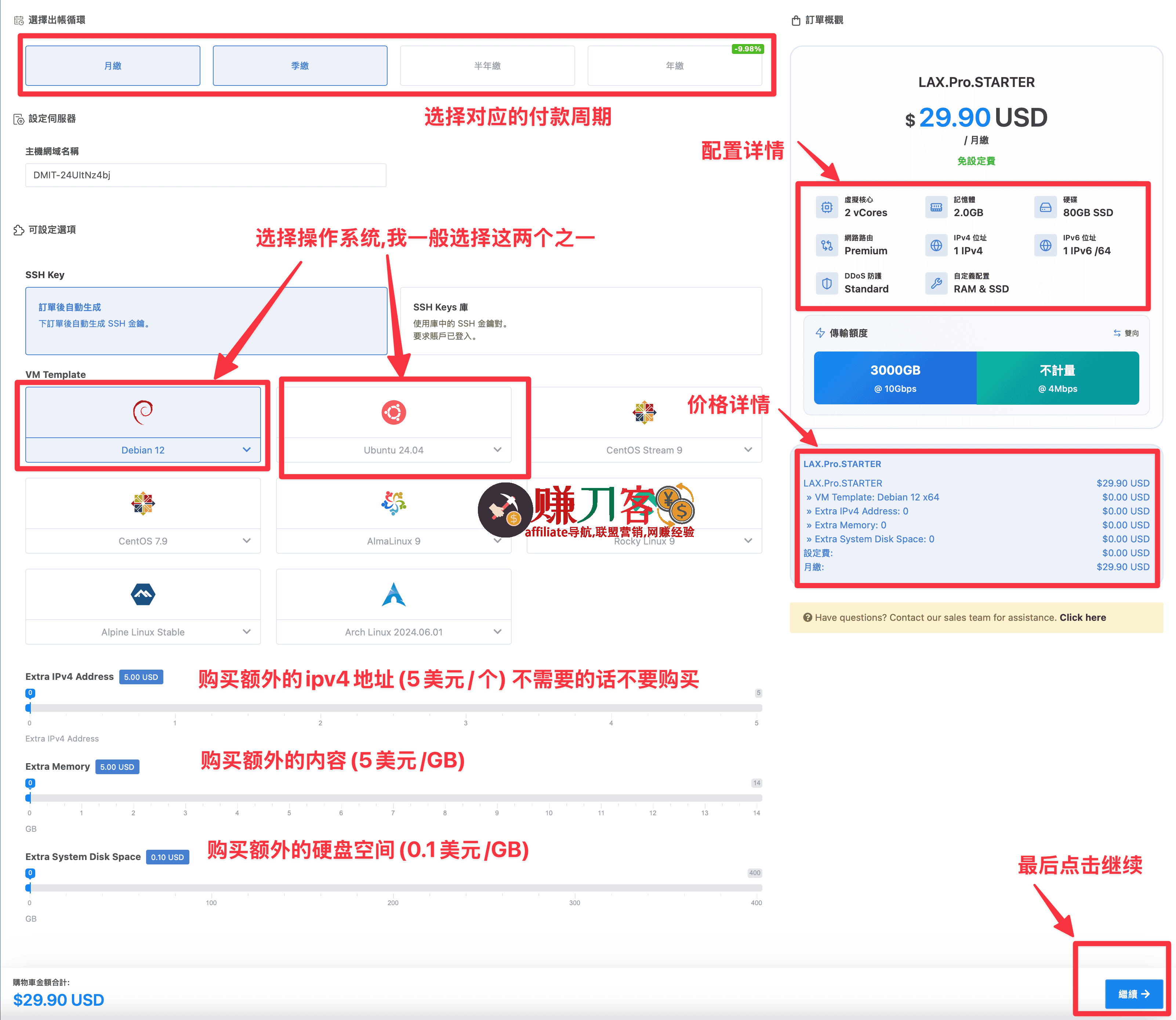 - 额外配置:根据需求选购额外的IPv4地址、内存或硬盘。
