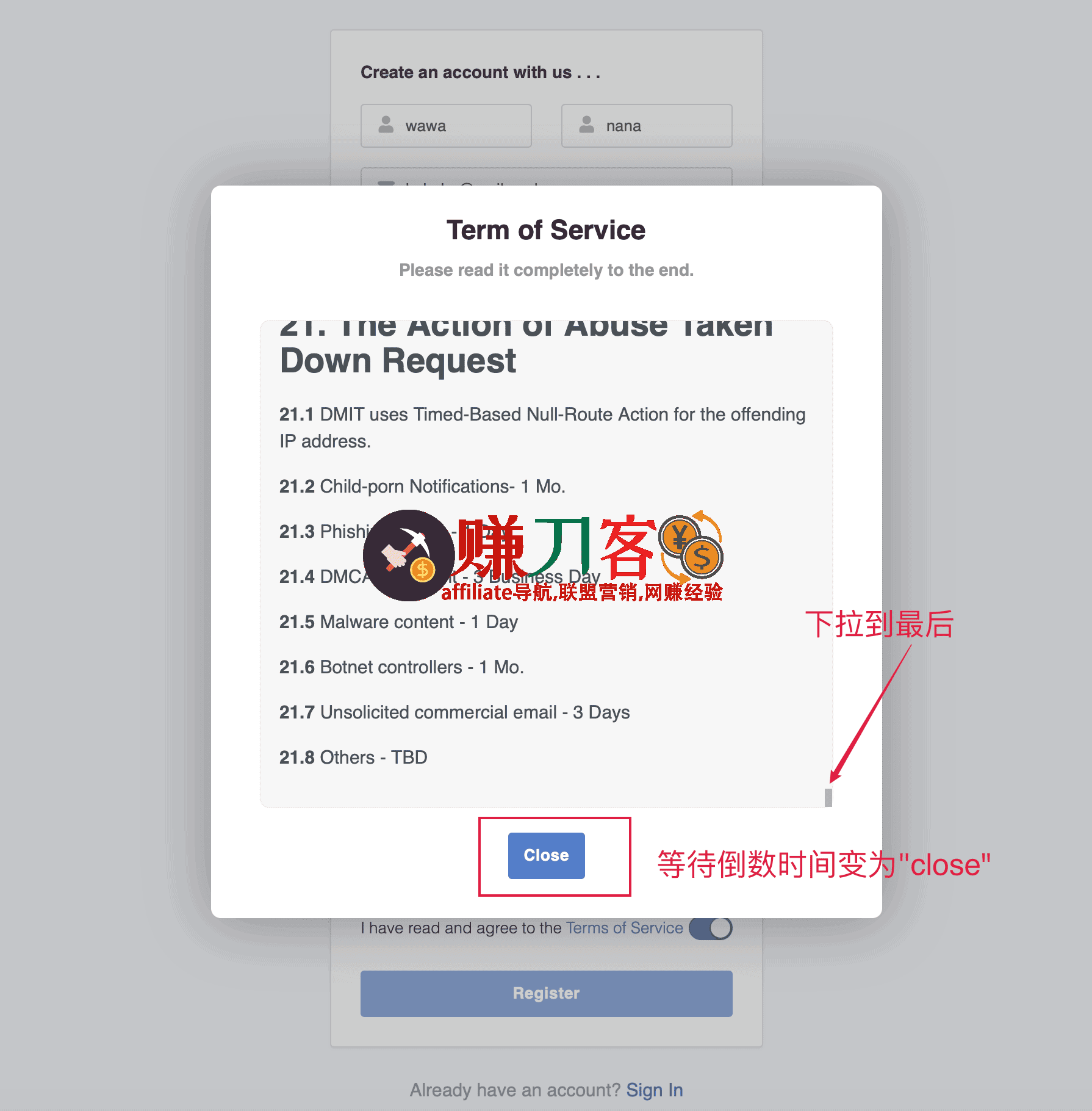 2.2 点击同意服务条款,在页面中弹出服务条款后,将滚动条拉到最底,等倒计时结束点“Close”按钮。