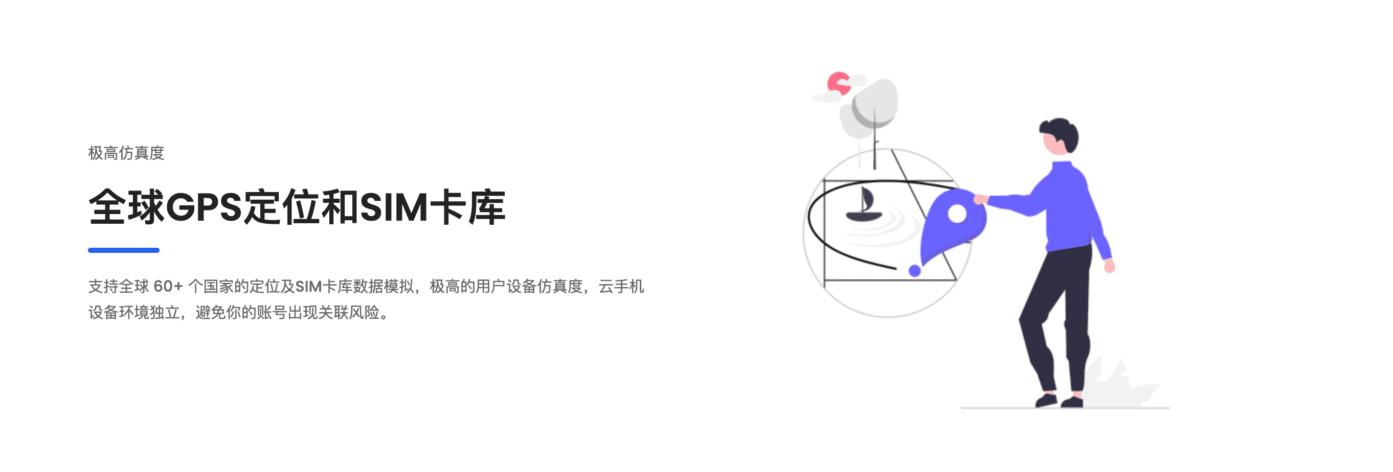 支持全球 60+ 个国家的定位及SIM卡库数据模拟,极高的用户设备仿真度,云手机设备环境独立,避免你的账号出现关联风险。